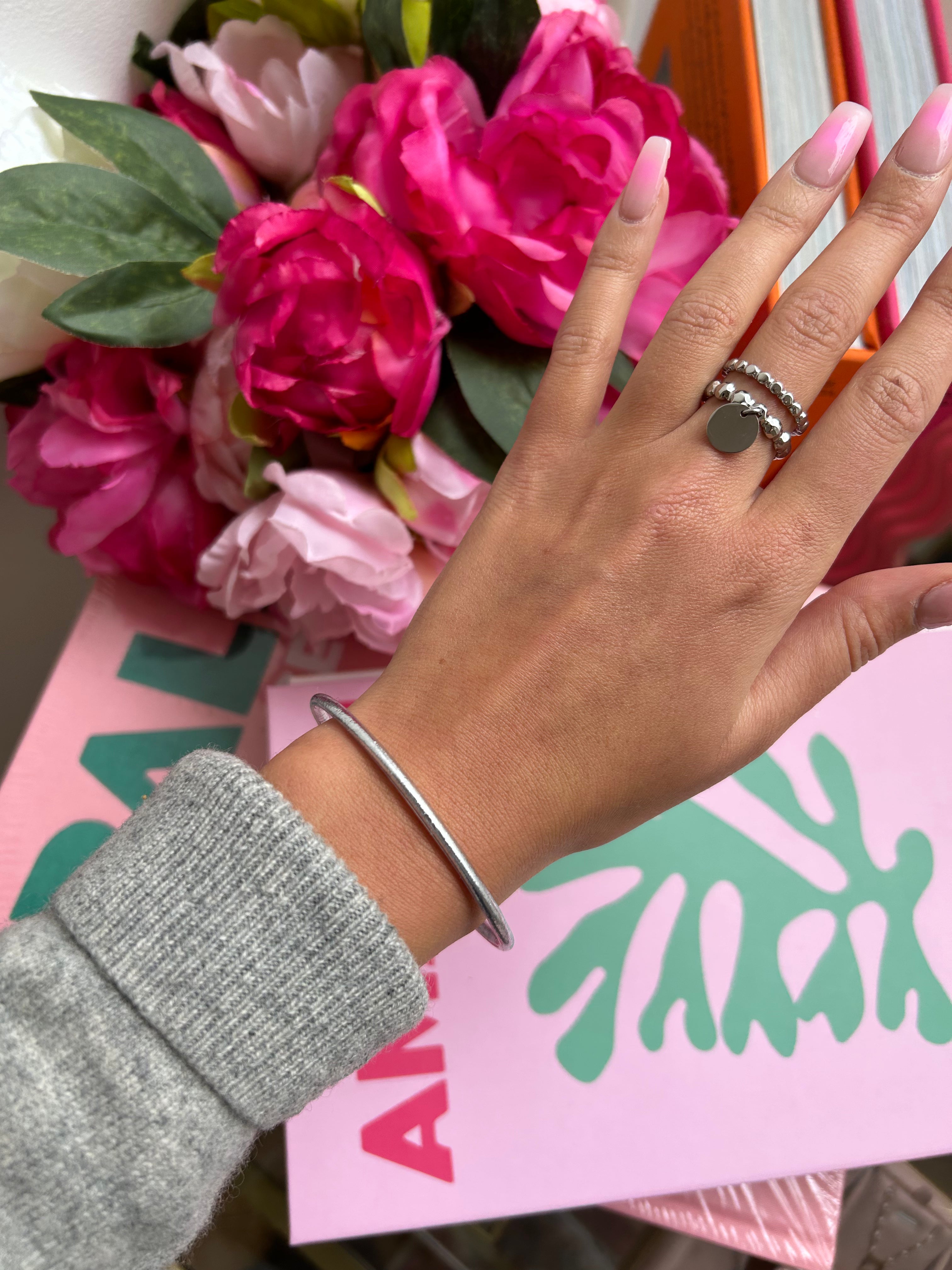 Jonc souple transparent rempli de feuilles argentées décoratives, scellé avec un mantra gravé "Bonheur, Chance, Fortune et Amour" en thaïlandais